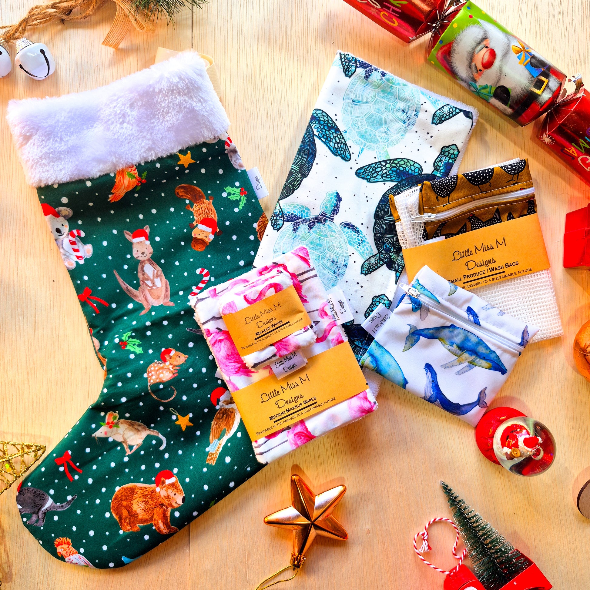 You can purchase just the Christmas Stock or we can prefill them with Little Miss M Designs products – 3 small & 2 Medium Makeup Wipes, a small Wash/Laundry Bag, Cleaning Wipe and a Soap Bag. We can also do a male pack which includes – 1 Large Swim/Wet Bag, Cutlery Pouch with Cutlery & a soap & Toothbrush Pouch. You can choose from 5 different designs – Floral, Natives, Animal, male or Surprise (we choose for you). Patterns may vary from photo.
