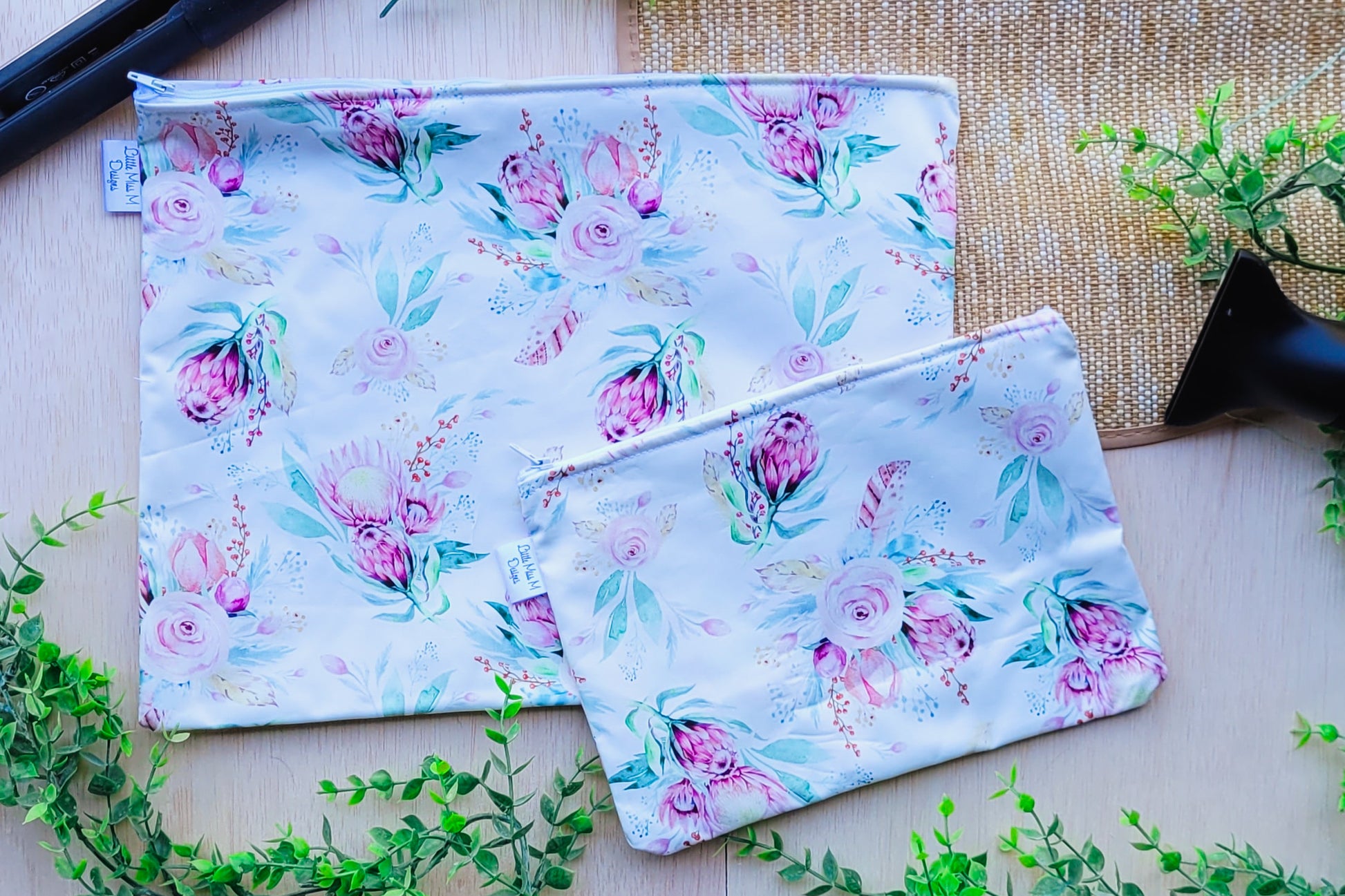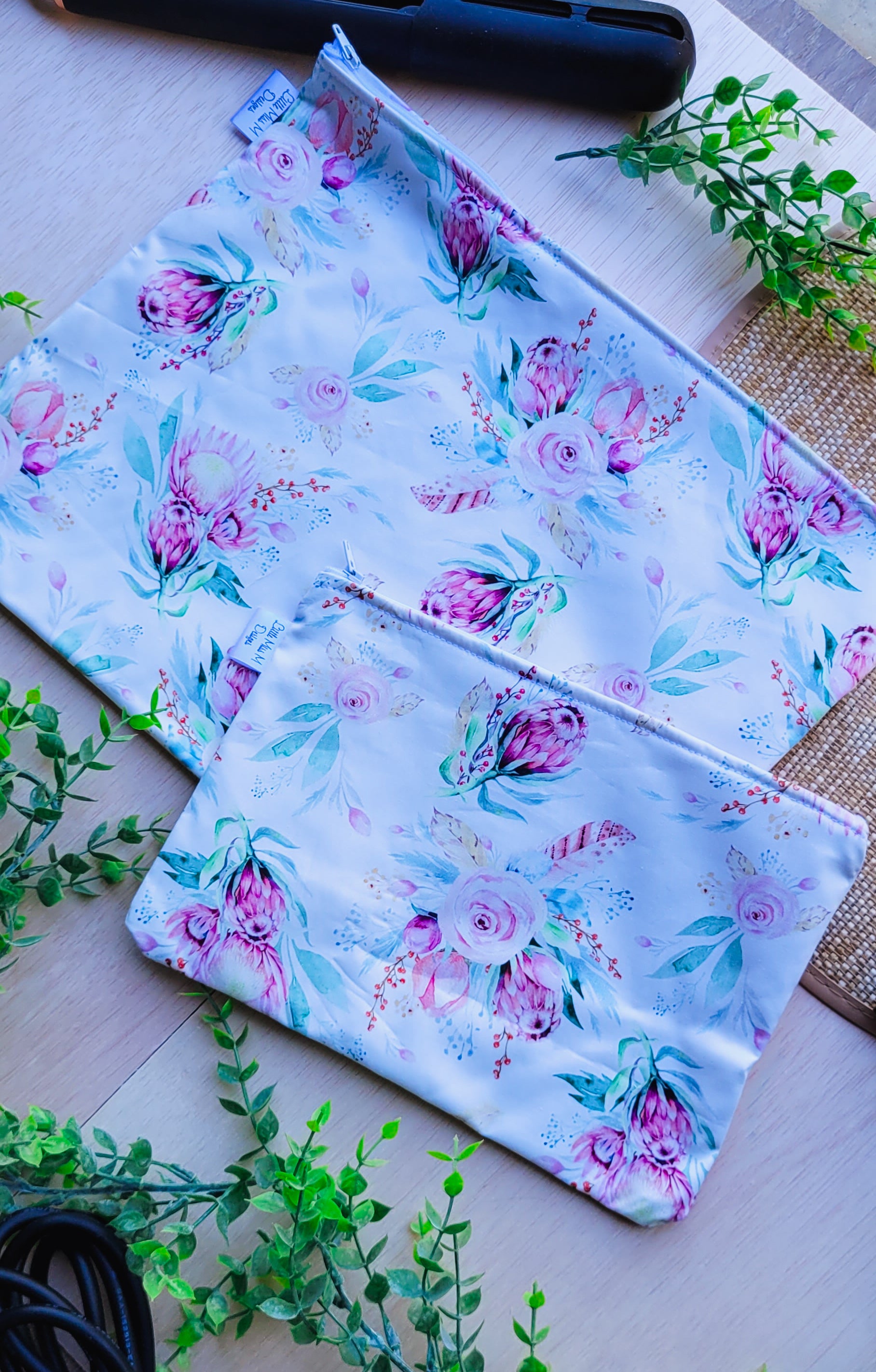 Keep all your beauty products in our practical, modern & stylish Travel Bags. We have 2 sizes available a Small - which is great for your makeup, skincare and travel essentials (our makeup wipes, Soap & Toothbrush Bags are great addition to these) ... and Large which will hold both your hairdryer and straightener. Made from 2 layers of 100% cotton with an easy open and close zipper. The inside is overlocked so no fraying will occur. They can be easily washed - just place in the washing machine with the zipper open and iron once dried.